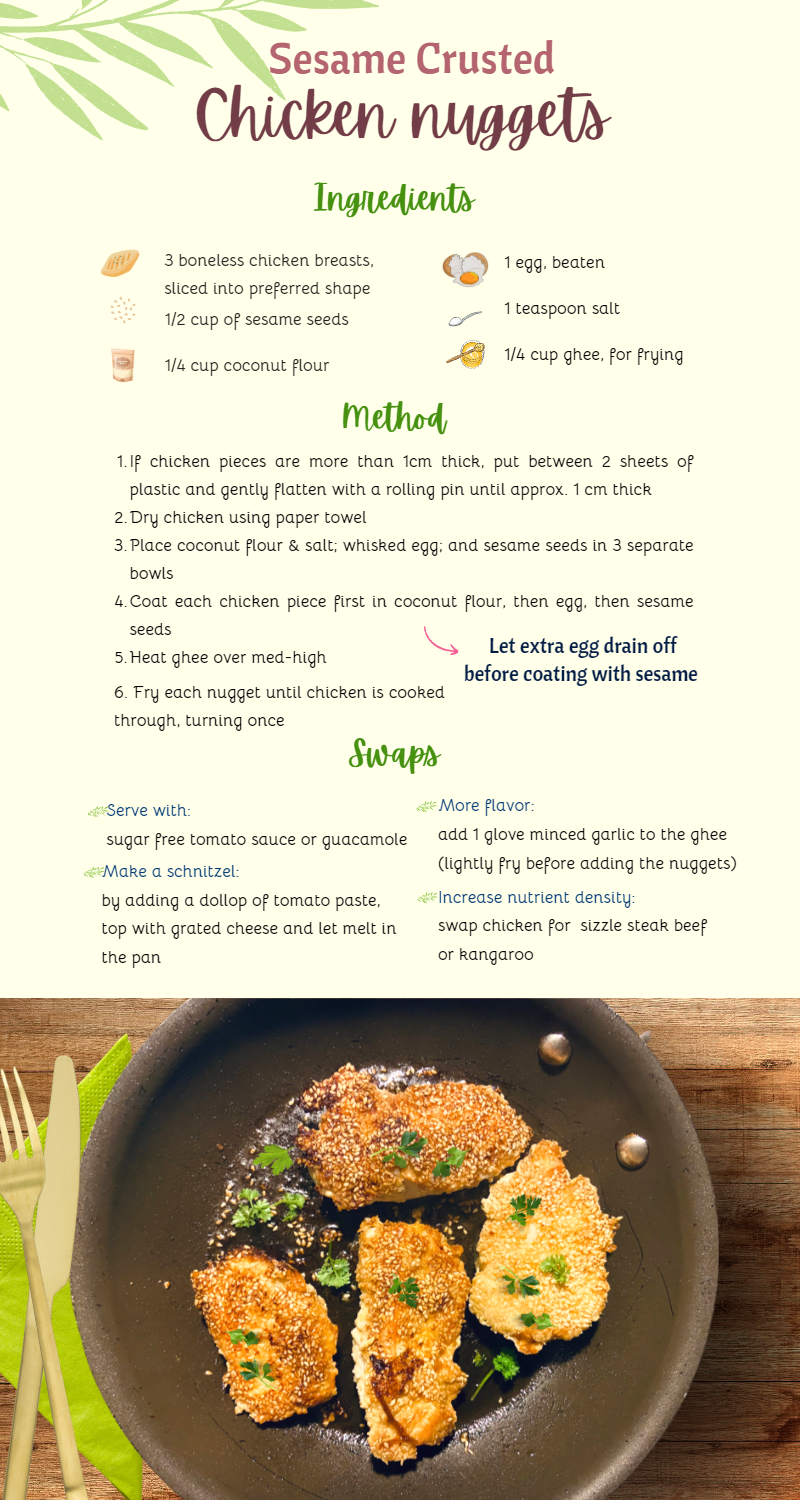 But wait, there's more! These nuggets are not just for chicken lovers. They can be made with turkey, pork, kangaroo or any other protein of your choice. And, you can customize the flavour by adding different spices and seasonings to the sesame seed coating. The possibilities are endless!